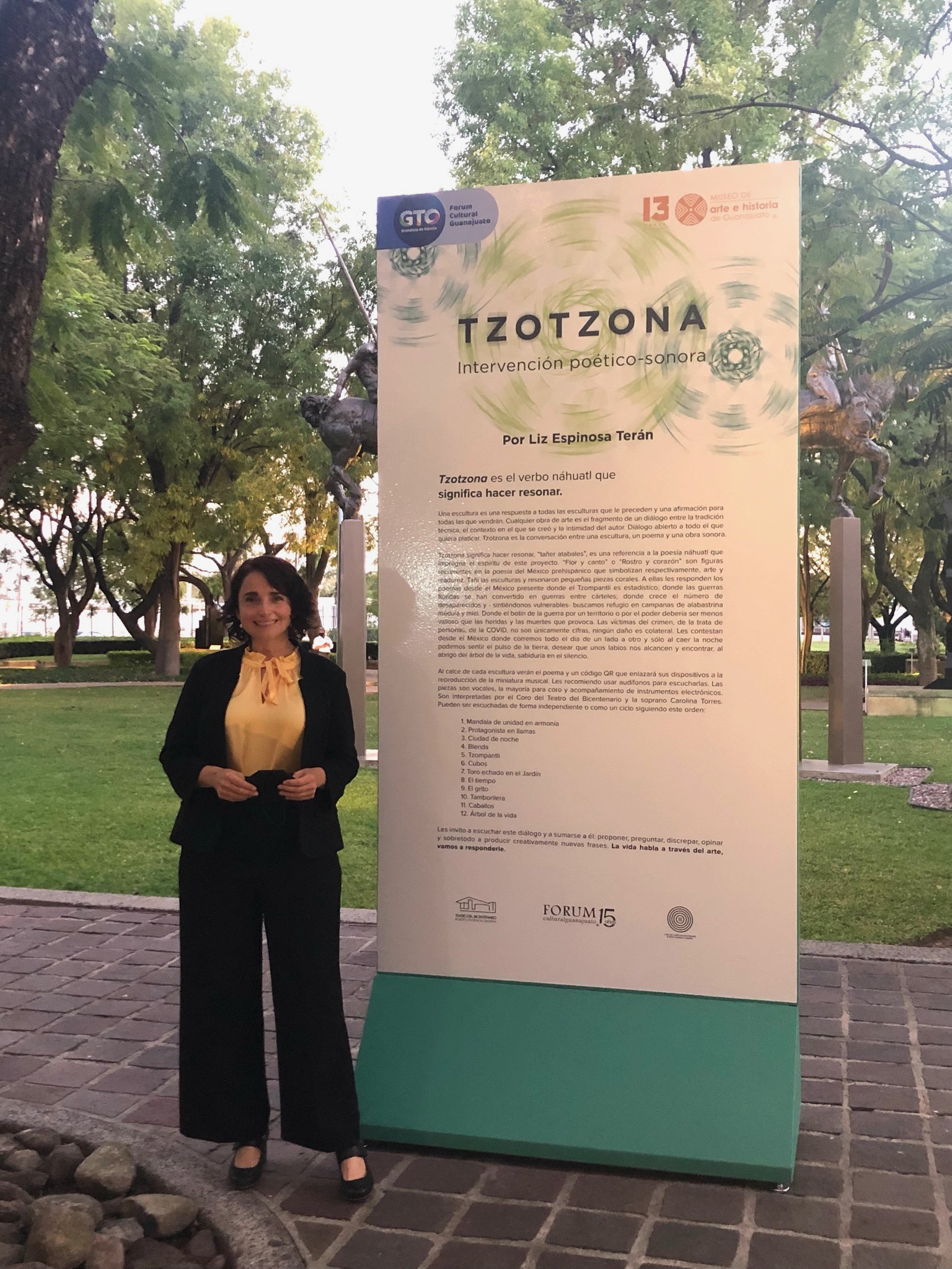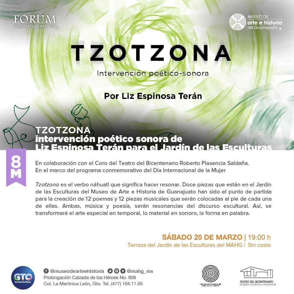 Tzotzona es una intervención poética y sonora que dialoga con las esculturas que habitan en el Jardín del Museo de Arte e Historia de Guanajuato. Ellas hablan, yo les respondo con música coral y con poemas cortos. La palabra tzotzona significa hacer resonar, “tañer atabales”, es una referencia a la poesía náhuatl que impregna el espíritu de este proyecto. “Flor y canto” o “Rostro y corazón” son figuras recurrentes en la poesía del México prehispánico que simbolizan respectivamente, arte y madurez. Tañí las esculturas y resonaron pequeñas piezas corales.