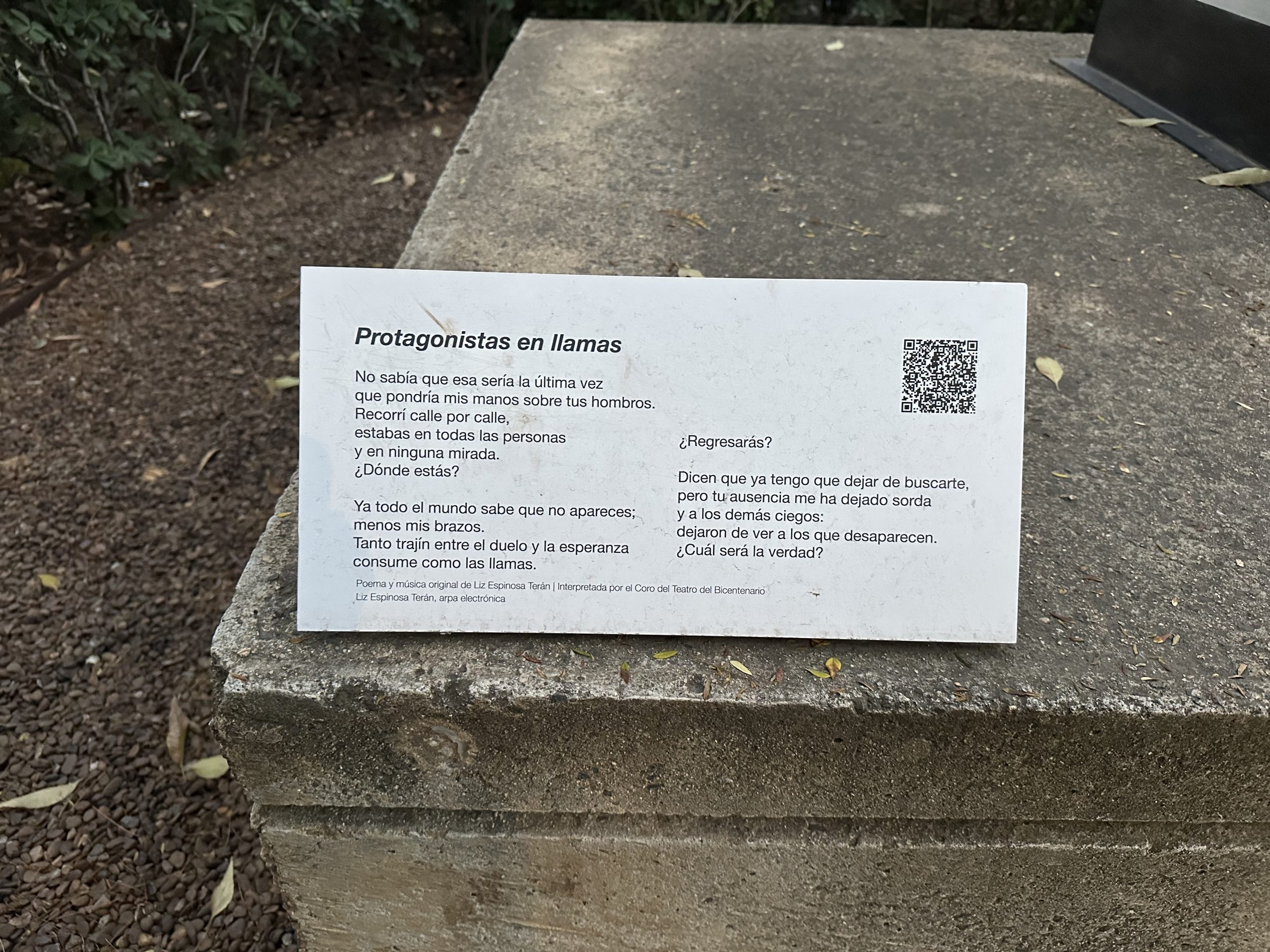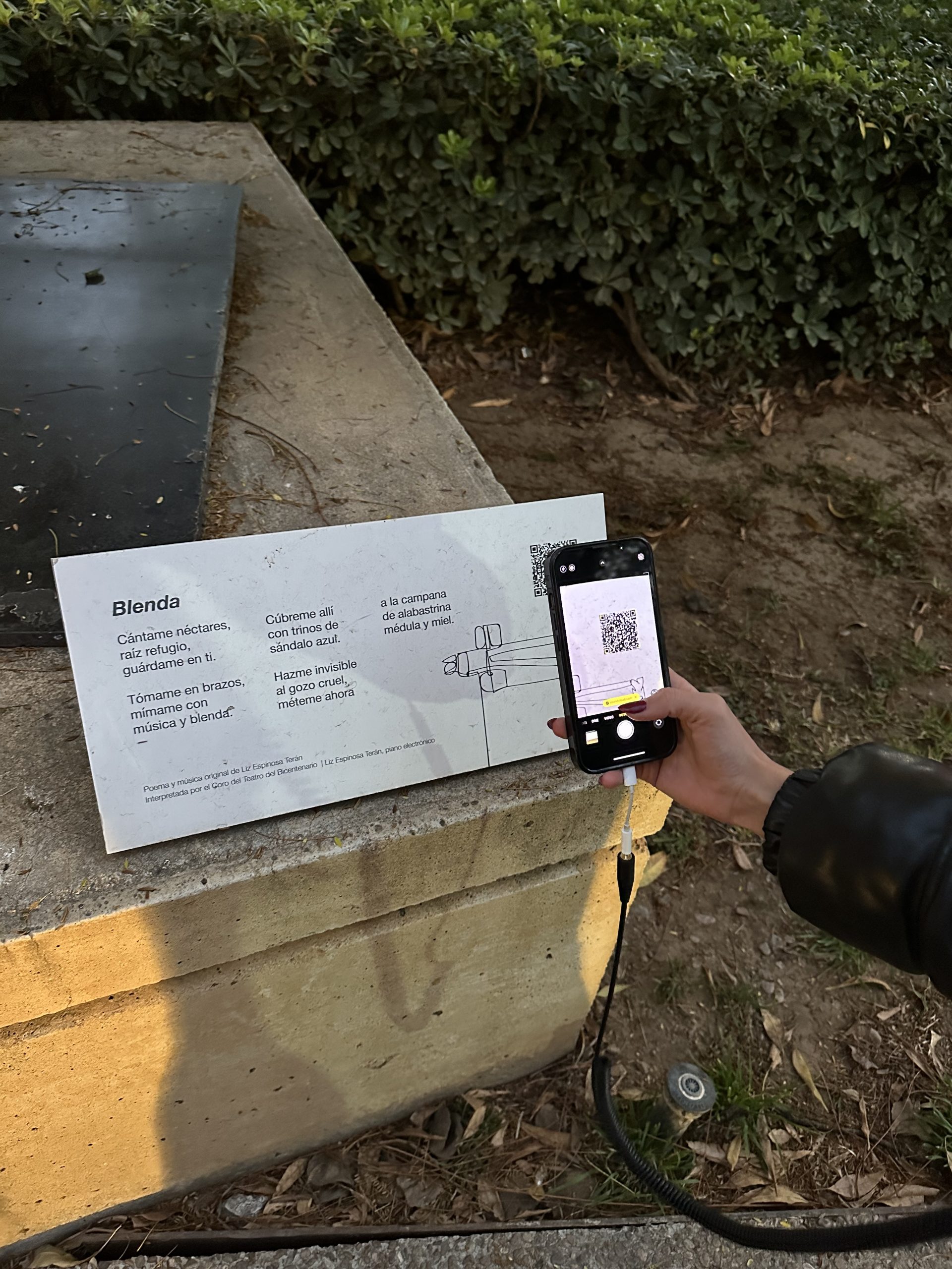 Es parte de la colección permanente del MAHG, por lo que todos los días encontrarán, al calce de cada escultura, un poema y un código QR que enlazará sus dispositivos a la reproducción de la miniatura musical. Las piezas son vocales, en su mayoría para coro y acompañamiento de instrumentos electrónicos fueron interpretadas por el Coro del Teatro del Bicentenario y la soprano Carolina Torres. Pueden ser escuchadas de forma independiente o como un ciclo siguiendo este orden: